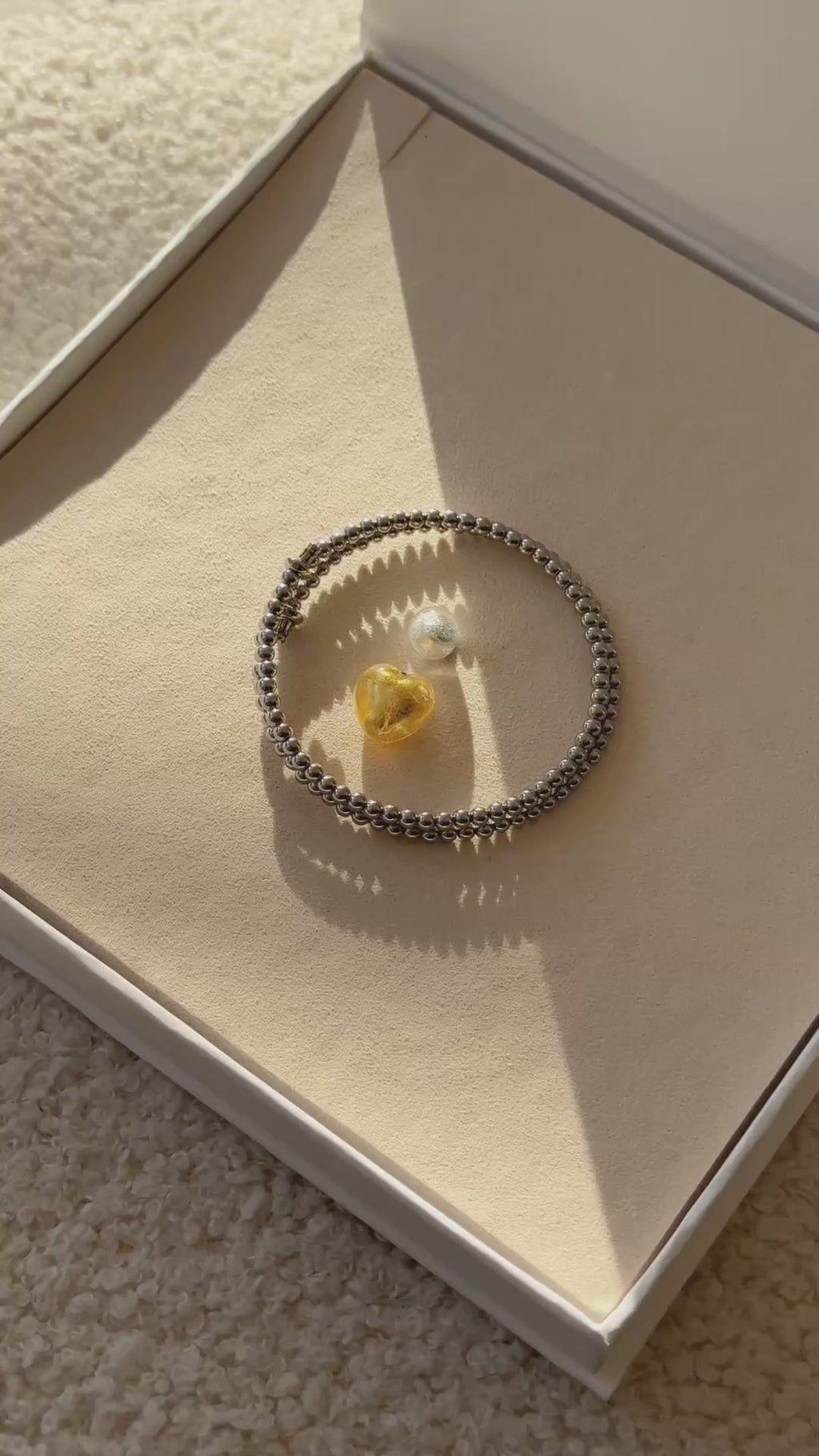 Bracelet modulable manufacturé dans notre atelier en Suisse. Fabriqué avec des billes en acier inoxydable de 3 millimètres de diamètre sur un fil acier à mémoire de forme, pour une tenue parfaite au poignet. Ici composé avec deux Décors Coeur Murano or avec une feuille d'or à l'intérieur.