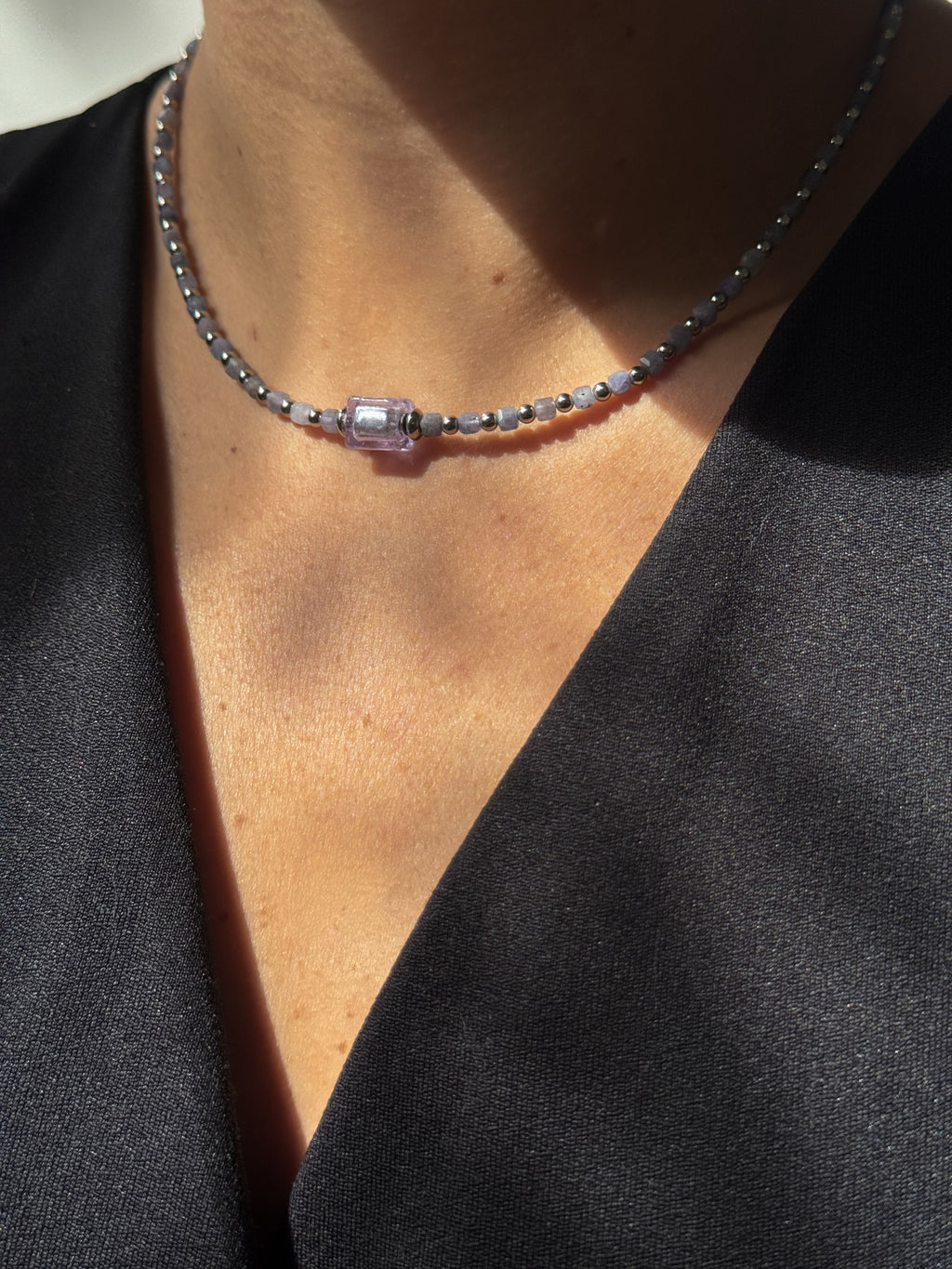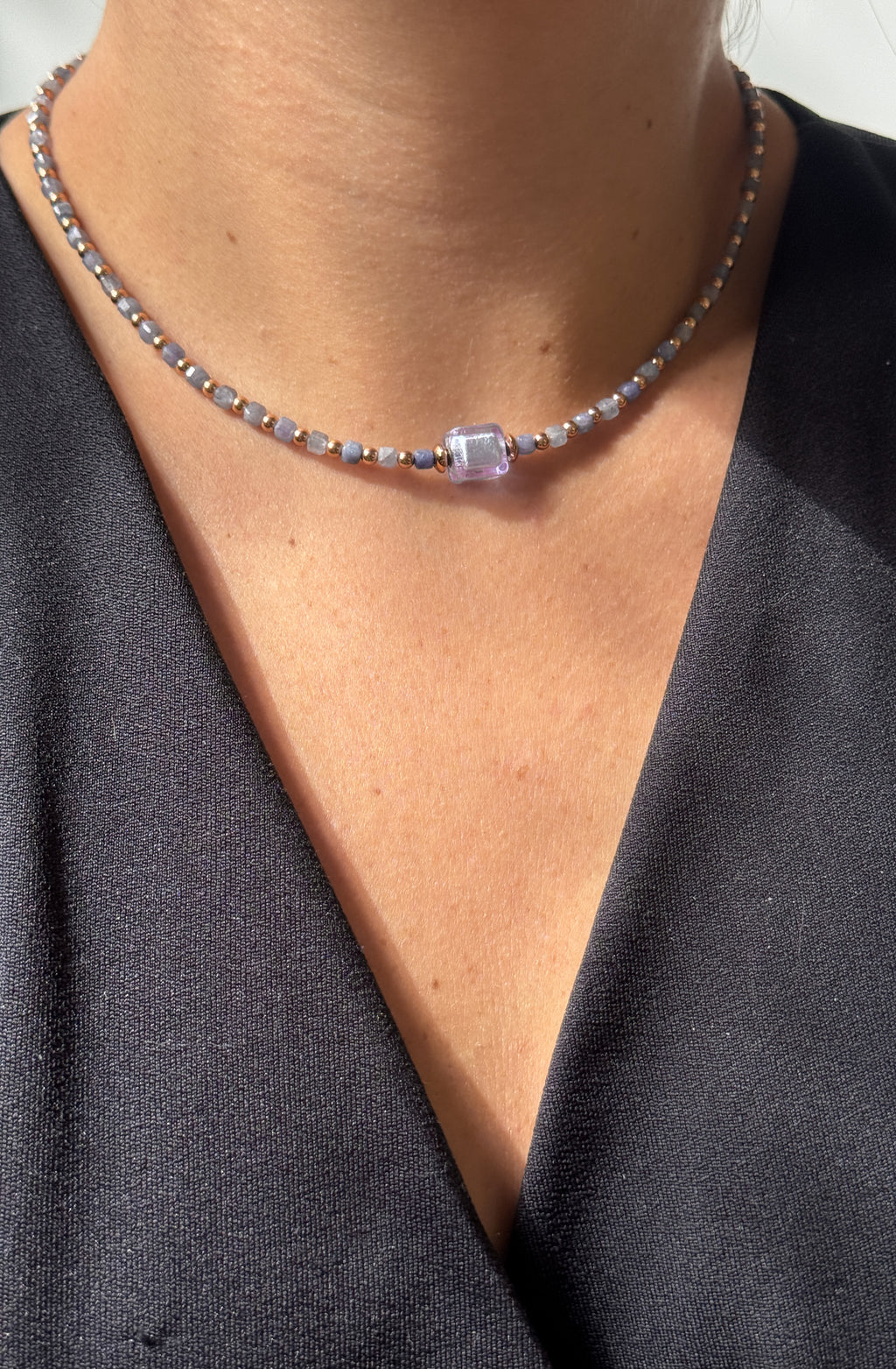 Collier modulable en pierres semi-précieuses Tanzanite de notre collection éphémère Constellation. Un bijou léger et envoutant grâce aux pierres cubiques mêlées à des billes en acier fin. Ce bijou est interchangeable avec tous les bijoux Liliflo.