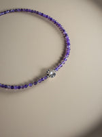 Collier en pierre semi-précieuse "Améthyste". Fabriqué avec des pierres facettées de 4mm de diamètre et des billes en acier de 2mm, assemblées sur un câble en acier pour une parfaite souplesse à votre cou. Modulable grâce à notre système de fermoir Harpoon breveté. Swiss made.