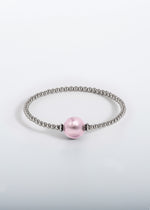 Bracelet modulable simple ou double tour manufacturé dans notre atelier en Suisse. Fabriqué avec des billes en acier inoxydable de 3 millimètres de diamètre sur un fil acier à mémoire de forme, pour une tenue parfaite au poignet. Ici composé avec un verre de Murano Rose.