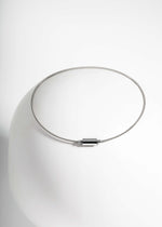 Collier modulable manufacturé dans notre atelier en Suisse. Une spirale en acier inoxydable de 2.00 millimètres de diamètre est montée sur un fil acier à mémoire de forme, pour une tenue parfaite au poignet. Ce bijou a été étudié pour être doux sur la peau et ne pas tirer les poils. Ici composé avec un Lien allongé en acier inoxydable.