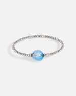 Modulares Armband, hergestellt in unserer Werkstatt in der Schweiz. Gefertigt aus 3 mm großen Edelstahlperlen auf einem Stahldraht mit Formgedächtnis für perfekten Sitz am Handgelenk. Hier mit Zenith Muranoglas.