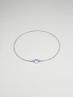 Collier modulable manufacturé dans notre atelier en Suisse. Une spirale en acier inoxydable de 2.00 millimètres de diamètre est montée sur un fil acier à mémoire de forme, pour une tenue parfaite au poignet. Ce bijou a été étudié pour être doux sur la peau et ne pas tirer les poils. Ici composé avec un véritable verre de Murano (Italie).