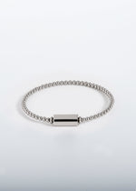 Bracelet modulable manufacturé dans notre atelier en Suisse. Fabriqué avec des billes en acier inoxydable de 3 millimètres de diamètre sur un fil acier à mémoire de forme, pour une tenue parfaite au poignet. Ici composé avec un Lien allongé en acier inoxydable.